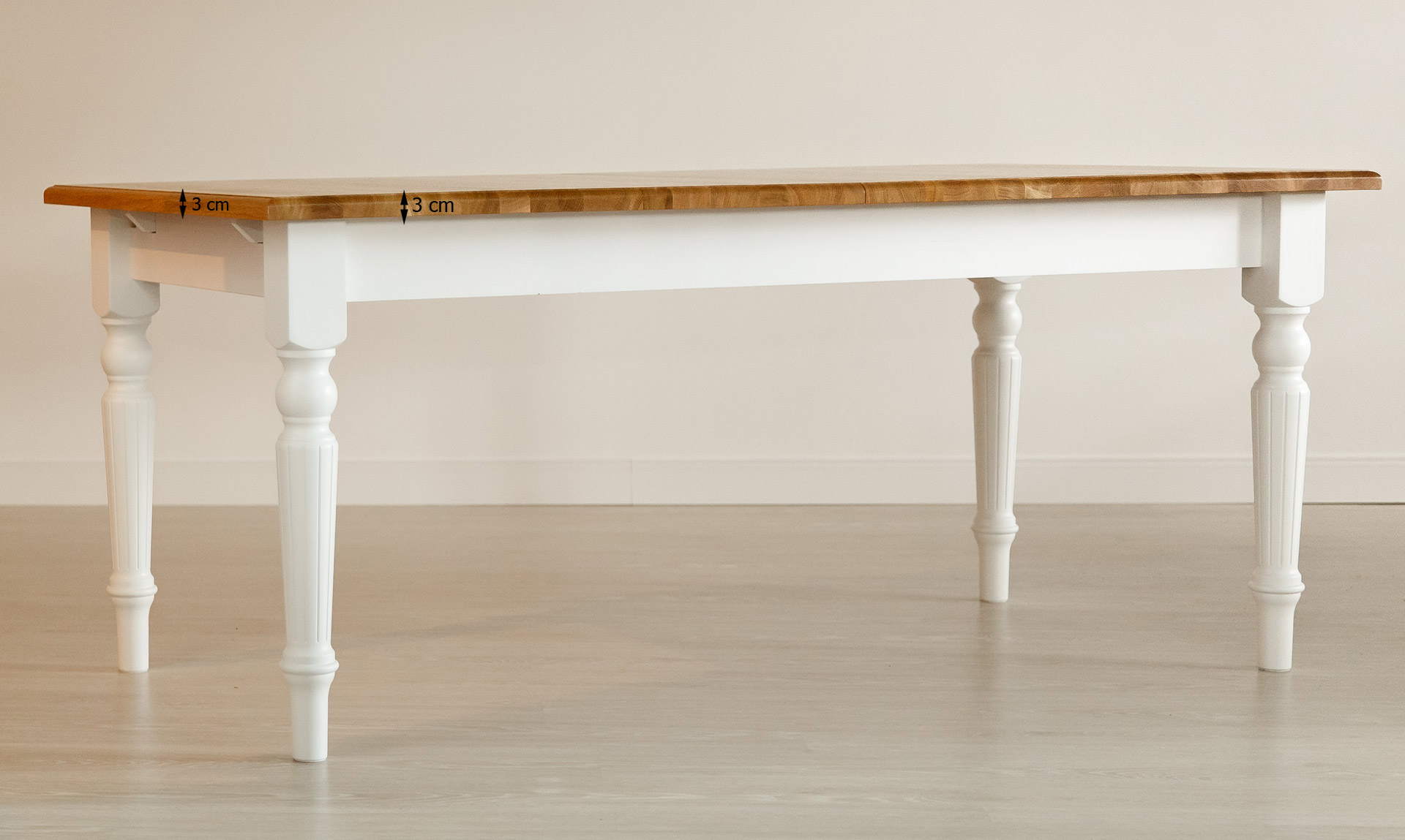 In der Basisversion wird der Tischkörper und die Beine in weißem Öko-Lack lackiert, hingegen die Platte im farblosen Öl behandelt wird. Es ist die Standardfarbe für diese Tische.