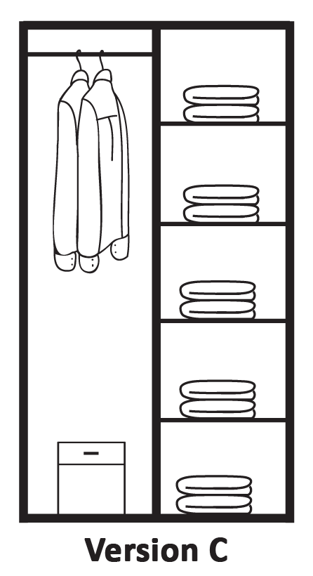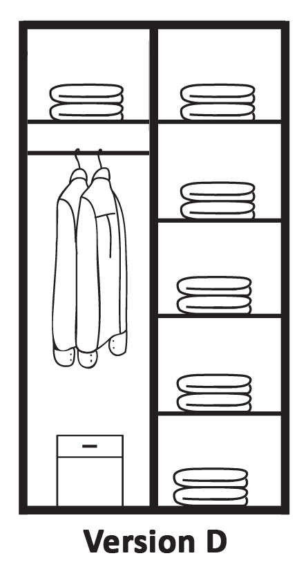 Im Inneren des zweitürigen Kleiderschrankes befinden sich auf der linken Seite eine Kleiderstange und auf der rechten Seite vier schmale Fächer. Solche Komposition ermöglicht eine praktische Plazierung der Kleidung im Kleiderschrank, wo jedes Kleidungsstück seinen Platz findet.