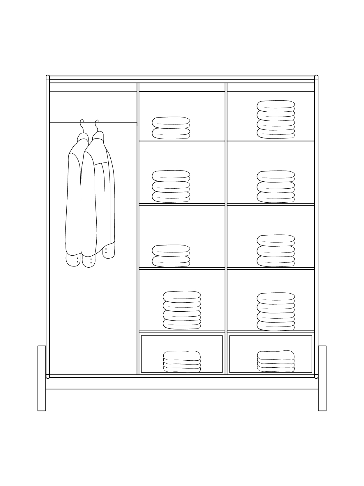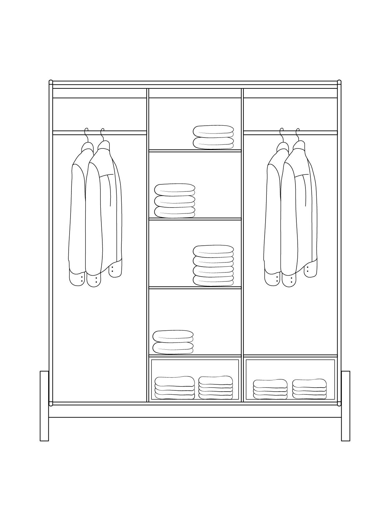 • in Version A: eine Kleiderstange im linken Bereich, drei Regalböden im mittleren Bereich sowie drei Regalböden im rechten Bereich.